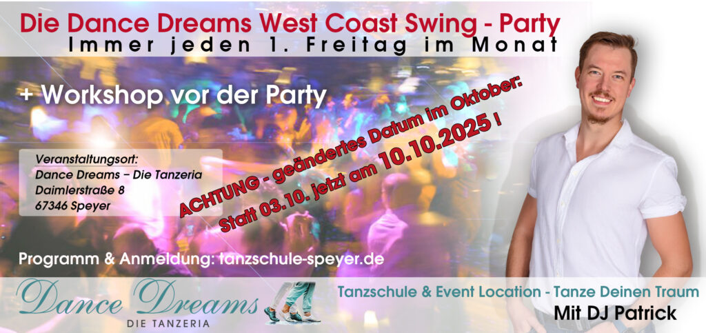 Ab sofort heißt es jeden 1. Freitag im Monat: Musik an, Tanzfläche frei und pure Tanzfreude! Bei unserem West Coast Swing Workshop und der anschließenden West Coast Swing Party in der Tanzeria von Dance Dreams erwarten dich tolle Musik, eine entspannte Atmosphäre und eine großartige Community.